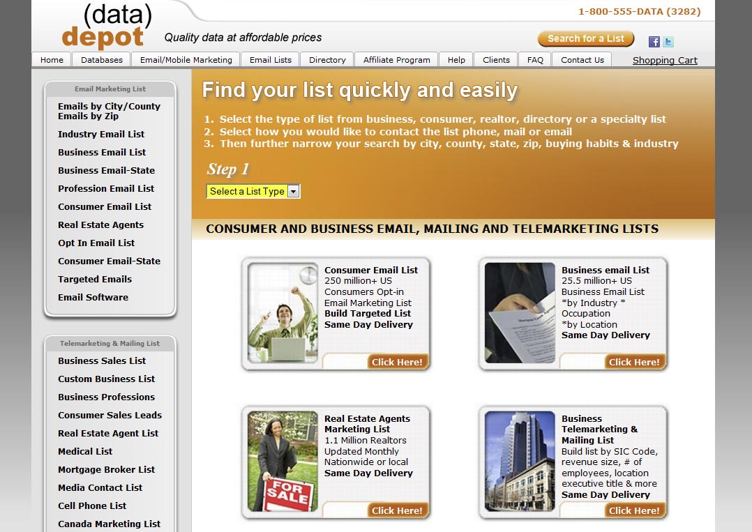 Data Depot Data Depot (www.DataDepot.biz) is a email address, telamarketing phone number, and mailing address list provider also offering a web based email marketing management platform. With their email lists they offer both targeted consumer and business lists. Their consumer email lists provide the opt-in website source and time stamp as well as additional consumer info including: name, phone number, gender, date of birth, income and location, and location. Their business email lists also include company name, contact name, title, address, phone, fax, company website, revenue, and other information. Both their Business and Consumer email lists start at $99.00 for 100,000 non-targeted records and $89.00 for 50,000 targeted records, with custom pricing for specific business industry emails lists. Their email list databases are updated monthly and orders are delivered same day. The Data Depot email marketing software starts at $15.00 a month with volume use pricing based on the number of emails sent per month.