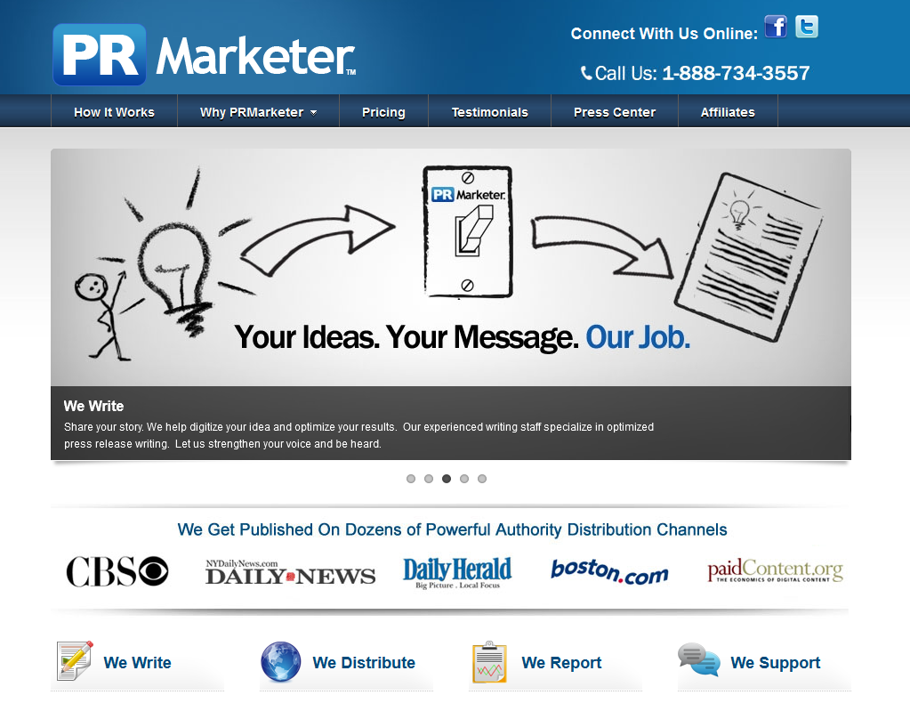 PRMarketer (www.prmarketer.com) is a full service (writing and distribution) Press Release marketing firm, established by brothers Michael, Patrick, and Anthony Santiago in 2010. PRMarketer provides a personal and completely hands-free Press Release marketing service, manually completed by a team of experienced Press Release marketers. PRMarketer pricing starts $199.00 per press release for the 'Pro' package, which includes: one-on-one support, a 350-500 word AP style Press Release professionally written as specified, web distribution, SEO and Social media optimization, reporting, , and a 24 hour turnaround. More comprehensive 'Pro Advanced' ($349.00 per) and 'Pro Media' $449.00 per) packages are also available, which include wider distribution to 100+ other news sites (including Google and Yahoo News) and local optimization. More