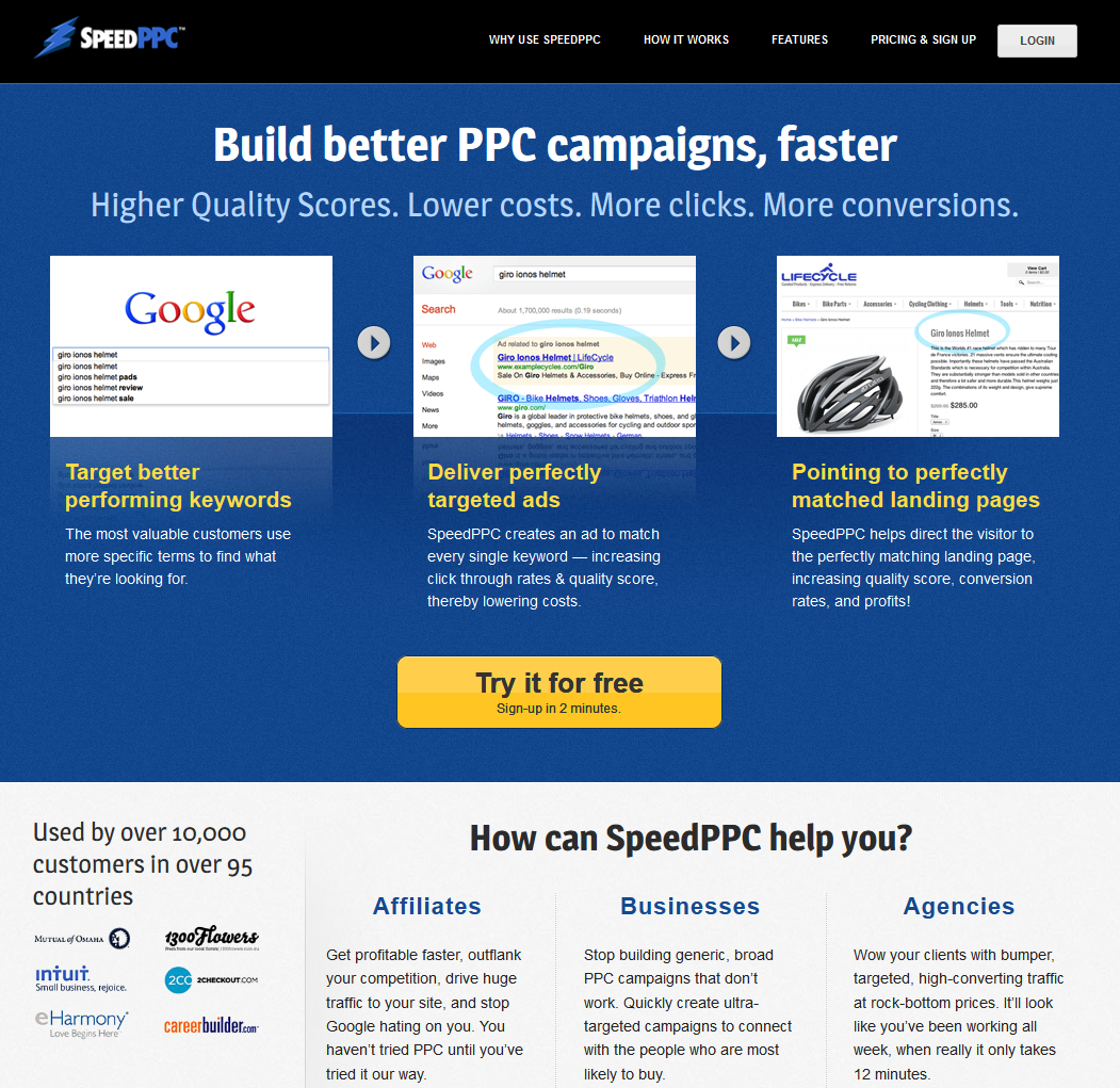 SpeedPPC SpeedPPC (www.speedppc.com) is a popular PPC Management software used by over 10,000 marketers worldwide. SpeedPPC provides Affiliate Marketers, Business Owners, and SEM Agencies alike an automated PPC optimization solution for finding and targeting better performing keywords, delivering more targeted ads to match specific keywords, and pointing ads to the most targeted landing pages. This converts to higher quality scores, lower PPC costs, more clicks and conversions, and higher ROIs. Additional features of SpeedPPC include competitor analysis, a dynamic banner builder, keyword research, extensive training and support, and many others. SpeedPPC supports multiple PPC advertising platforms, including the big two Google Adwords and Bing Ads, as well as many others to allow for multiple campaign uploads and management. SpeedPPC is free to try for the first 7 days, thereafter with pricing starting at $53.90 per month (billed annually) or $77.00 per month (billed monthly) for the 'Pro' plan. The 'Team' plan, which includes up to 20 users, costs $160.30 per month (billed annually) or $229.00 per month (billed monthly). All purchases are backed by a 30 day 100% satisfaction or money back guarantee. SpeedPPC runs on both the browser and desktop for maximum speed and works on both Mac's and PC's.