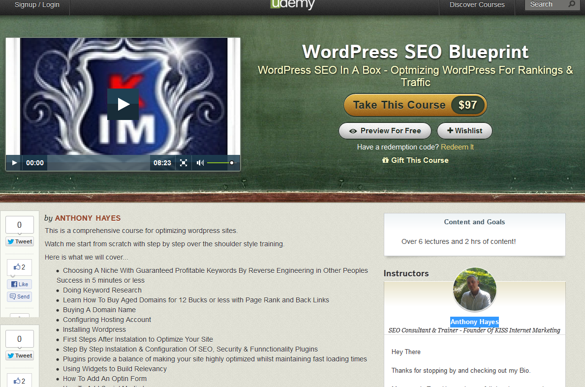The WordPress SEO Blueprint course instructor, Anthony Hayes, is a full time internet marketer with over 5 years experience providing SEO services and creating custom SEO software and wordpress plugins. Tony now serves as a full time SEO consultant and trainer. His Udemy Wordress SEO training course teaches the proper way to set up a Wordpress blog, and how to properly optimize Wordpress blogs to reach the highest positions in the search engines as possible. The course is divided into 6 lectures, presented in over 2 hours of video content. The course costs a one time $97.00, is available immediately after purchase and as with all Udemy courses is backed by a 30 day satisfaction or money back guarantee.