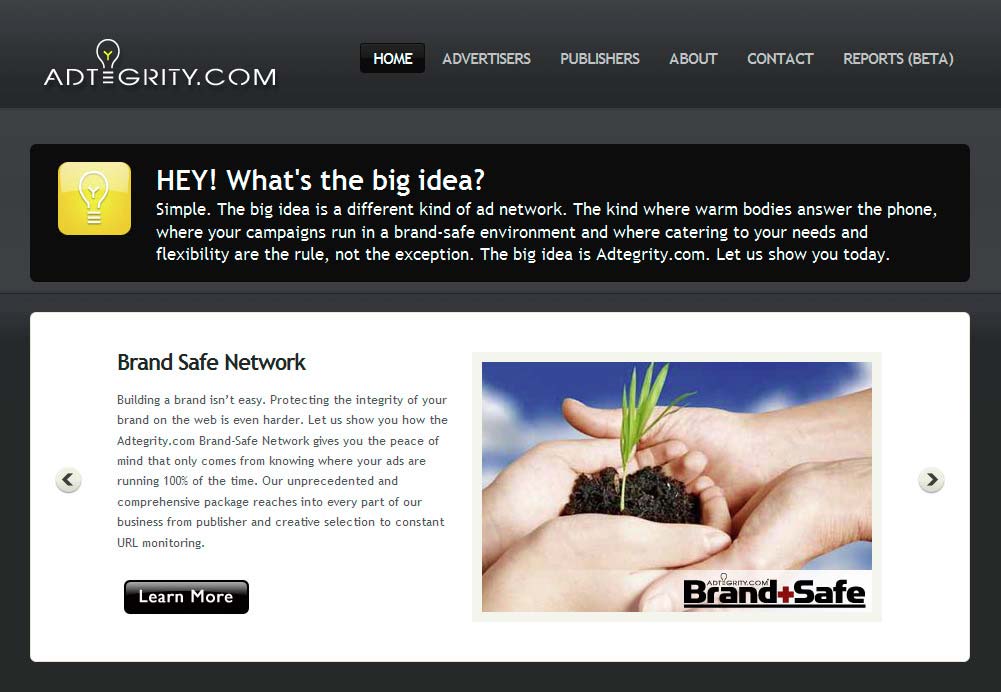 AdtegrityFounded in 1999 by Scott Brew, Adtegrity (www.adtegrity.com) is a 'Brand Safe' ad serving network reaching 75 million users and serving 10 billion ad impressions per month. Adtegrity carefully screens all their publishers to ensure advertisers ads are never published next to questionable, adult or illegal content. Ategrity offers several targeting options including Channel, URL, Contextual, Geographic, Demographic, Behavioral and Retargeting options. With flexible CPM, dCPM, CPC or CPA pricing choices ads can be served in most standard banner sizes or in pop-unders with flash and rich media ad serving also available.